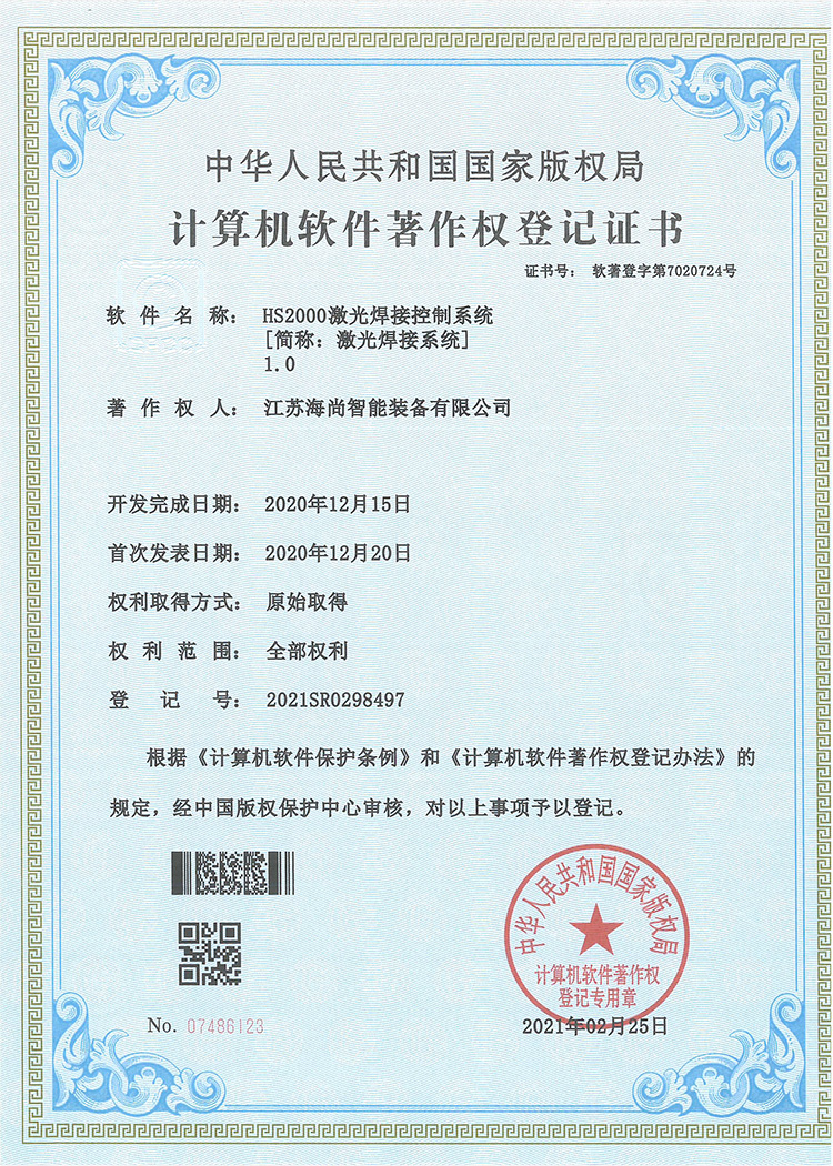 HS2000激光焊接控制系統(tǒng)著作權(quán)證書