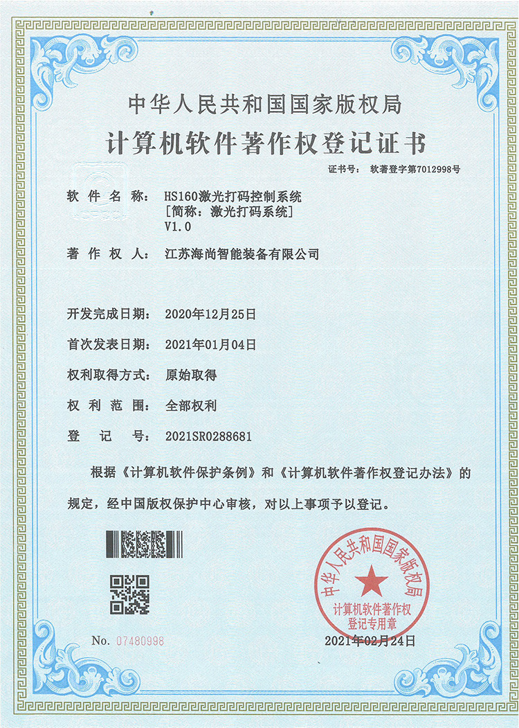 HS160激光打碼控制系統(tǒng)著作權(quán)證書